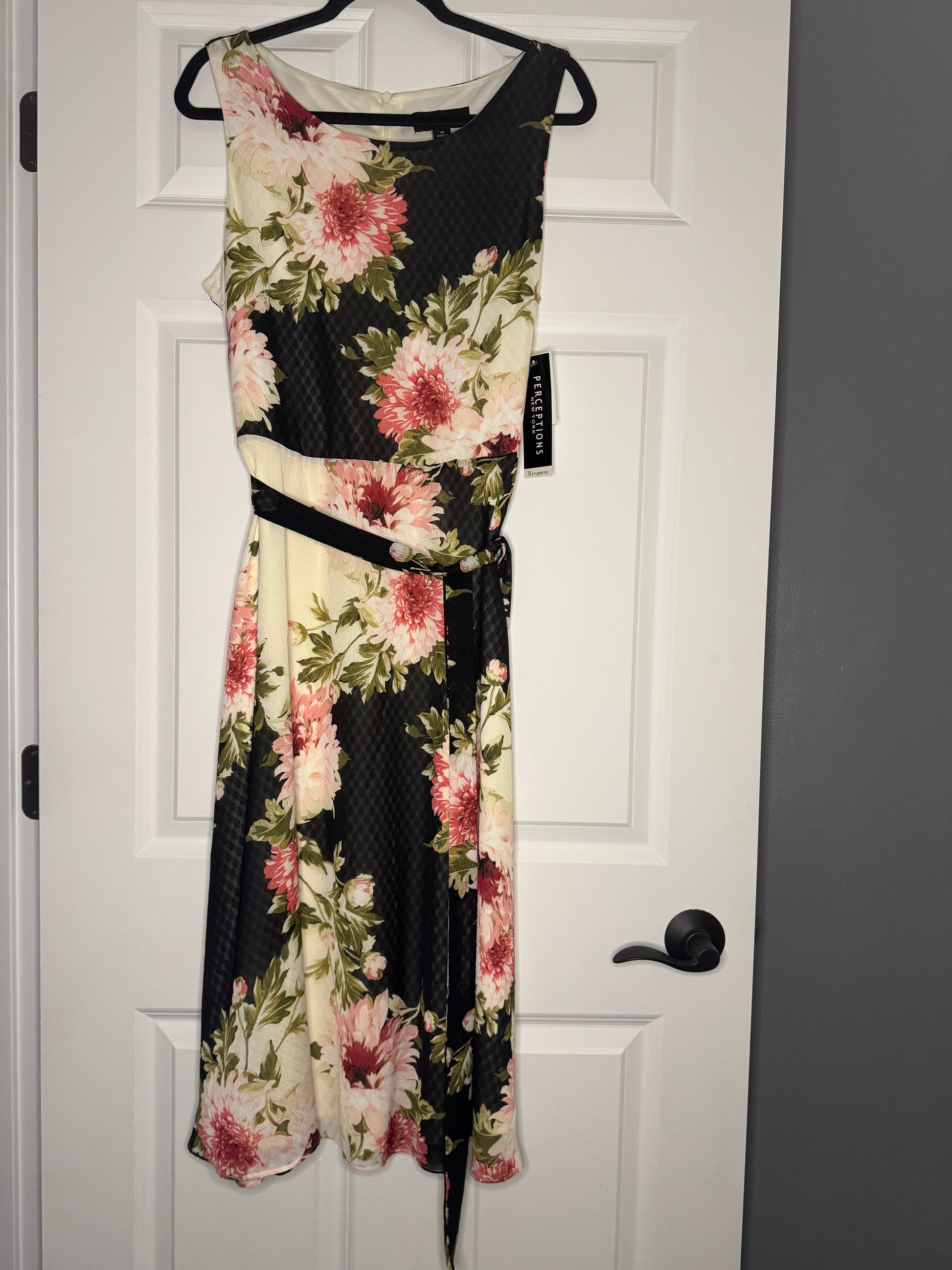 Perceptions New York sleeveless dress w belt size 14 cream black w pink green floral nwt $74